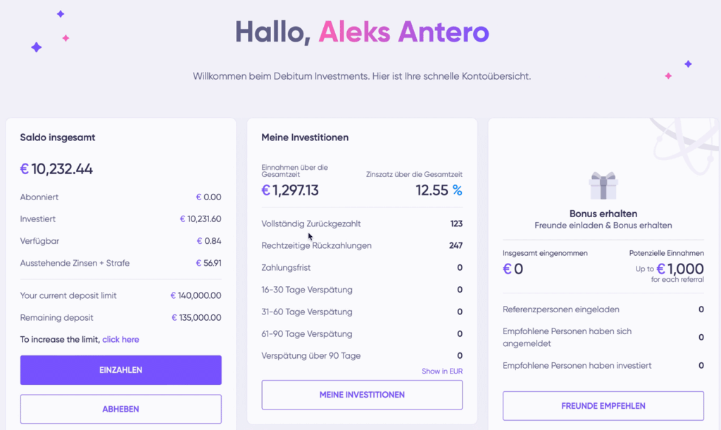 Bisher habe ich rund 10.000 € bei Debitum investiert, die auf viele unterschiedliche Kredite verteilt sind. Bei allen Investments habe ich meine Zinsen immer pünktlich erhalten. Unterm Strich bin ich sehr zufrieden. Die Plattform wirkt solide, reagiert schnell auf Support-Anfragen und die Rückflüsse landen pünktlich auf dem Konto.