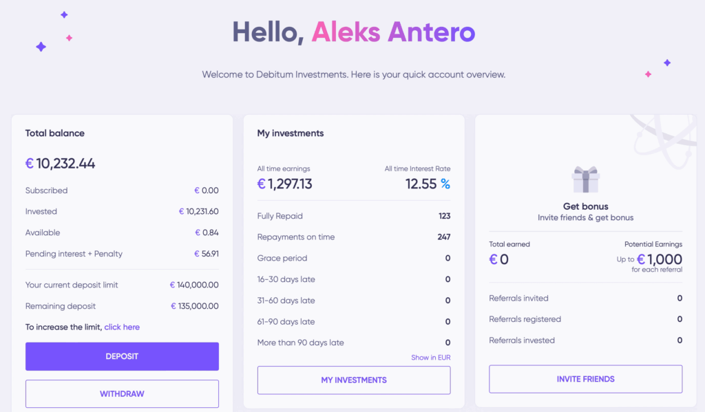 So far, I have invested around €10,000 with Debitum, spread across many different lendings. I have always received my interest on time for all investments. All in all, I am very satisfied. The platform seems solid, responds quickly to support requests and the returns arrive in my account on time.