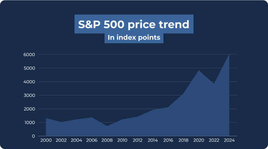 The S&P 500 is also showing its strength in the short term. In 2023, the index achieved a return of 24.7%. An investment of €10,000 would have increased to €12,470 within that year. These figures illustrate the potential of the S&P 500 to generate attractive returns for both long-term and short-term strategies.
