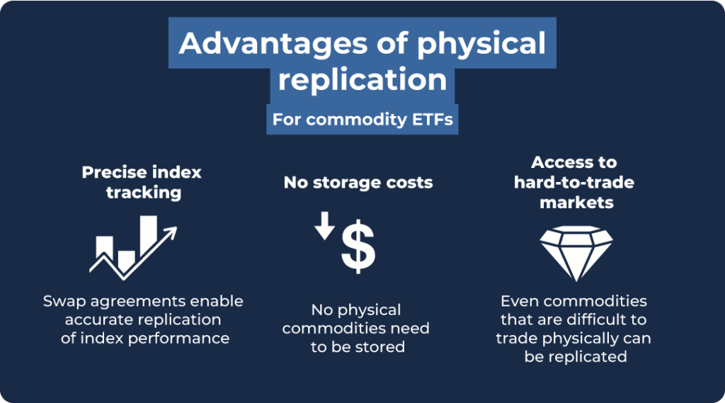 Synthetic replication can offer advantages for complex or difficult-to-access indices, but it does involve a certain counterparty risk. It is particularly useful for commodity or currency indices.
