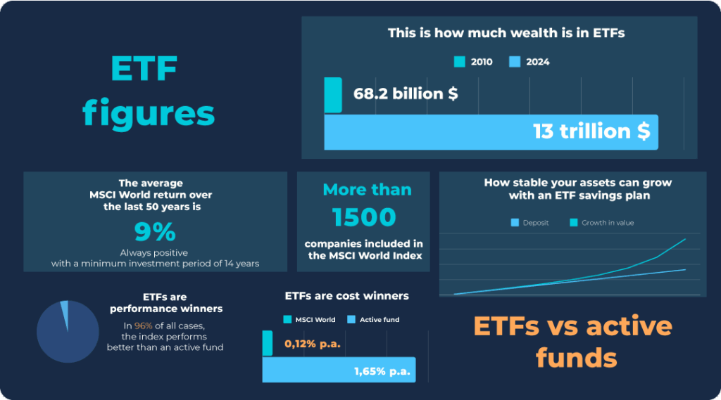 Here’s an example to illustrate this: instead of laboriously selecting and buying 100 different stocks, you simply invest in an MSCI World ETF. With just one purchase, you are invested in over 1,600 companies worldwide. This not only saves time, but also significantly reduces risk.