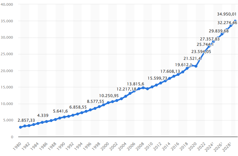The graph shows the steady growth of the US economy. The forecasts for the coming years also appear to be quite positive, with continued growth expected. There are repeated predictions that the US economy will collapse or that a recession will spread. However, this does not seem to be the case.