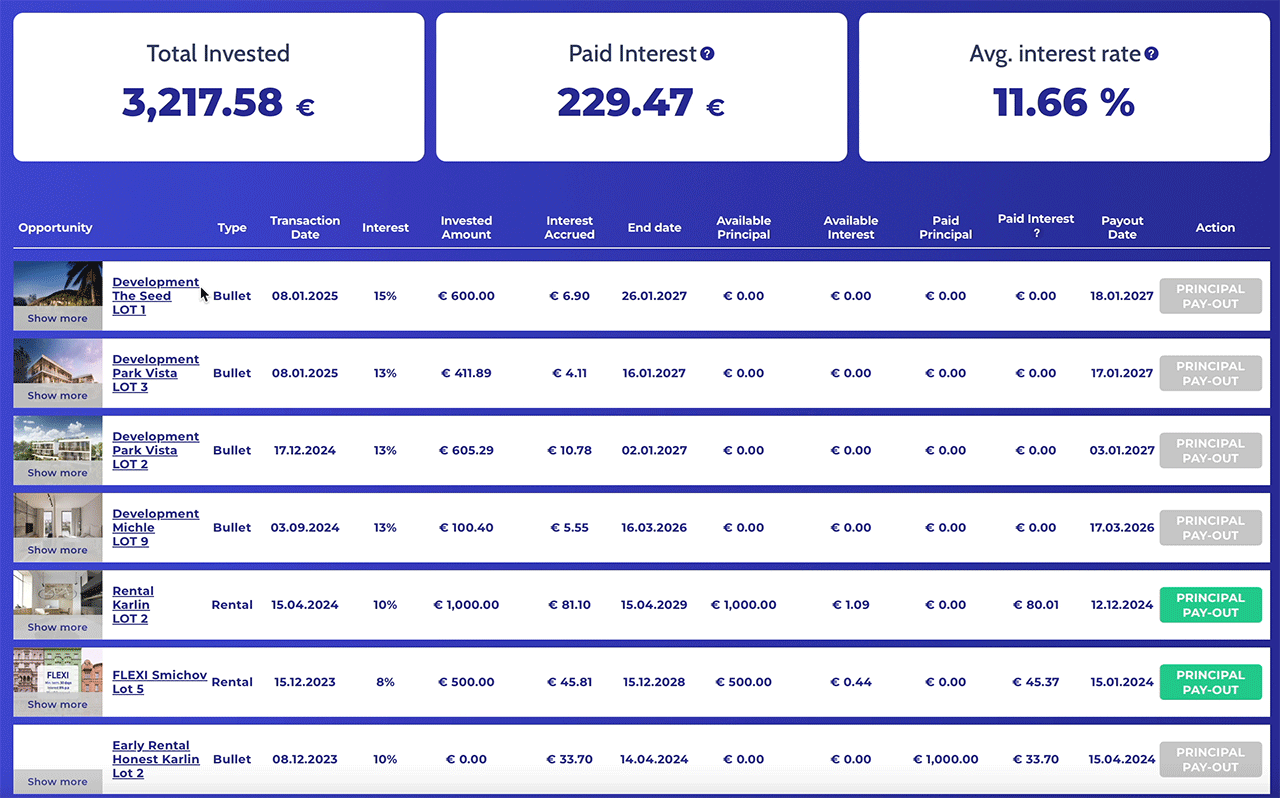I have invested my money – currently over €3,000 – in various lending in order to achieve good diversification. The largest amount is €1,000 in the ‘Karlin’ project, for which I receive 10% interest.