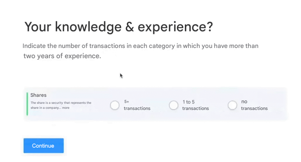 - Now you need to state your experience of the financial markets. Don’t worry if you haven’t had any experience with investment products yet: your answer won’t have any negative consequences. If you state that you have no experience, TR will simply inform you about the specific features and risks of the asset before you make your first investment. This extra support is one of the reasons why, in my view, this broker offers one of the best brokerage accounts for beginners.