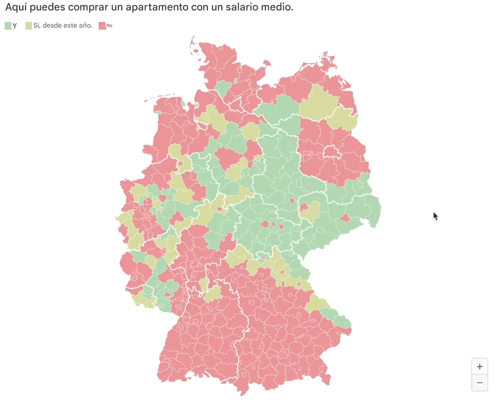 Si miramos hacia el sur, la situación cambia de nuevo. En Baden-Württemberg solo hay un distrito en el que se puede comprar una propiedad con un salario medio. Todos los demás distritos están en números rojos. No es de extrañar que en Baviera se observe una situación similar.