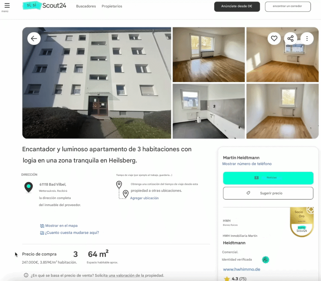 Veamos el siguiente inmueble: Un piso de tres habitaciones con 64 m² en una zona residencial acomodada de Fráncfort del Meno. El edificio se construyó en 1965, se renovó por última vez en 2025 y ahora tiene la clase energética B. Precio: 247 000 €.
