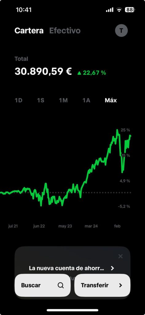 - Inversiones: compras individuales mediante órdenes limitadas cuando veo buenas oportunidades y planes de ahorro mensuales en ETF y acciones seleccionadas.