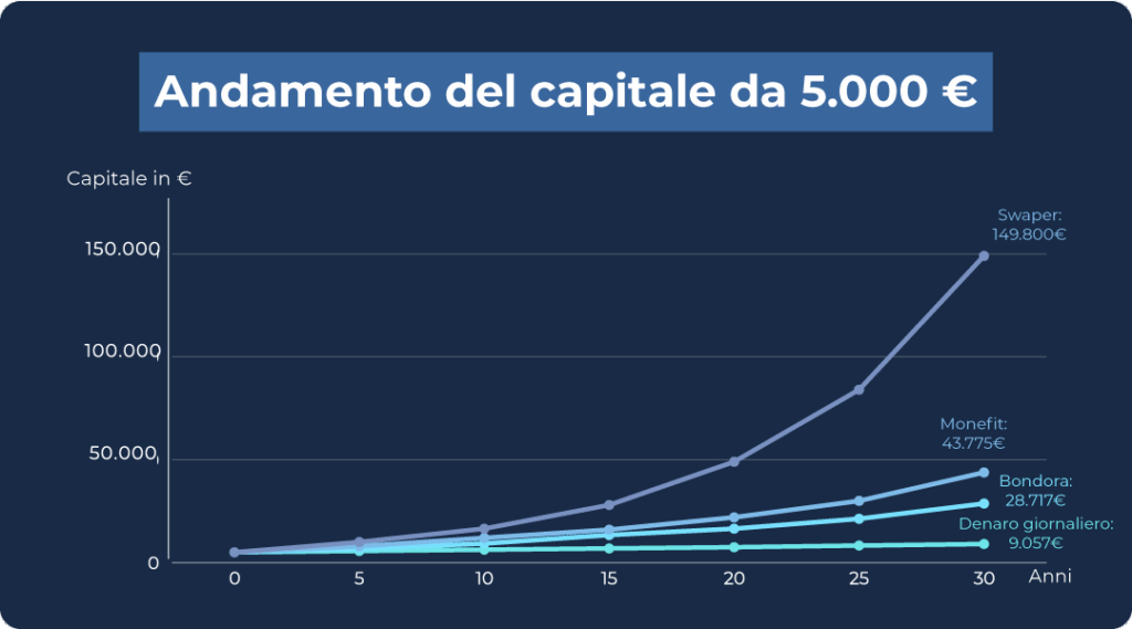 Consideriamo ad esempio un investimento di 5.000 € su un periodo di 30 anni: