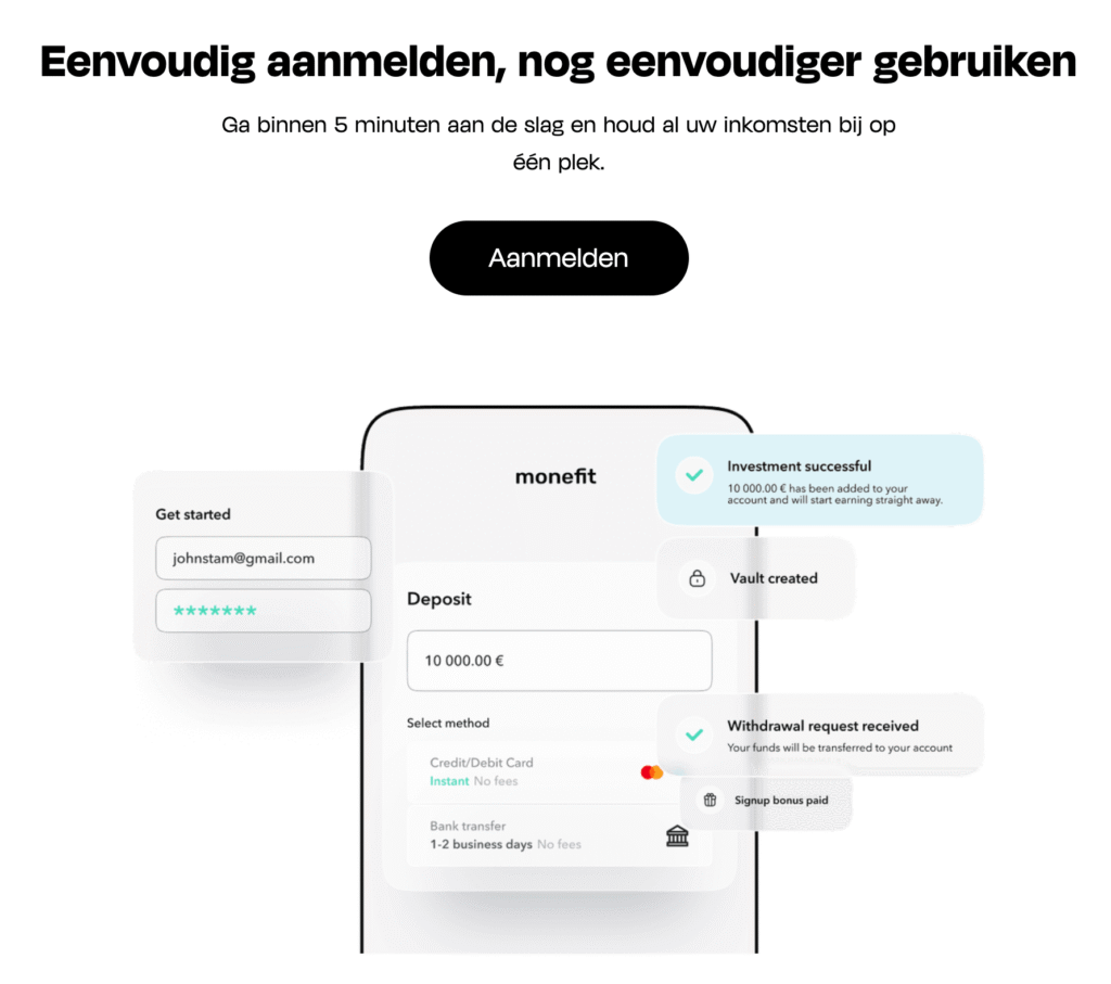Een belangrijke reden waarom mijn ervaringen met Monefit zo positief zijn: alles werkt super eenvoudig en zonder onnodige opties! Ook de registratie vormt hierop geen uitzondering. Gebruik best mijn link om direct €5 bonus en 0,5% extra rente gedurende de eerste 90 dagen mee te pakken.
