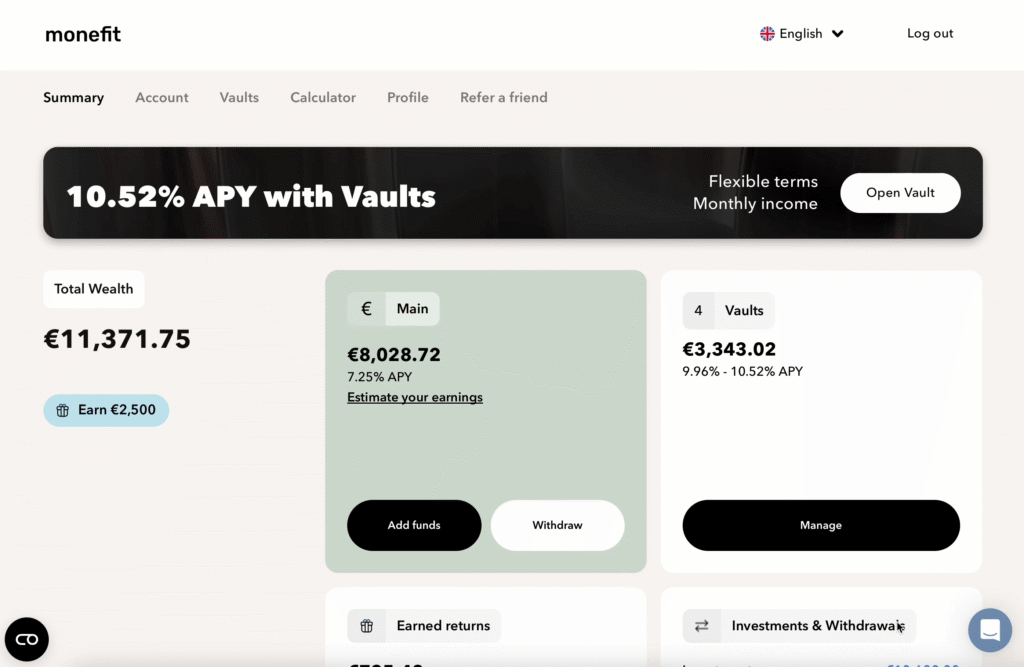 Monefit maakt het analisten zoals ik lastig, want wat valt er nog te zeggen over zo’n simpele en overzichtelijke platformervaring? Na je registratie en eerste login zie je meteen een stijlvol, strak dashboard: