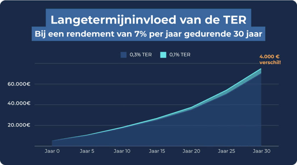 De TER geeft de totale kosten van een fonds weer. Ze wordt uitgedrukt als een percentage en wordt jaarlijks aangerekend. Een TER van 0,5% betekent bijvoorbeeld dat elk jaar 0,5% van het belegde bedrag wordt gebruikt om de kosten van het fonds te betalen. Gelukkig zijn de kosten van ETF’s meestal vrij laag en worden ze in de praktijk vaak gecompenseerd door het rendement.