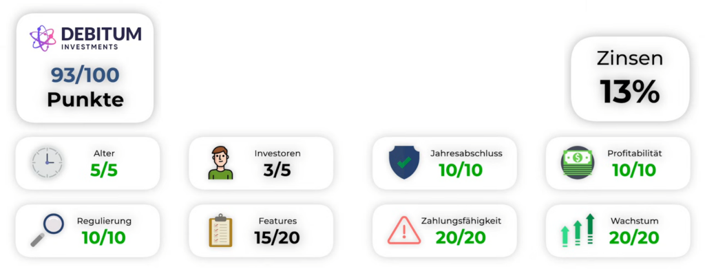 Das Gesamtergebnis ist extrem stark: 93 von 100 möglichen Punkten! Damit belegt Debitum Investments, wie gewohnt, einen der Spitzenplätze im Northern Finance P2P-Kredite-Vergleich!