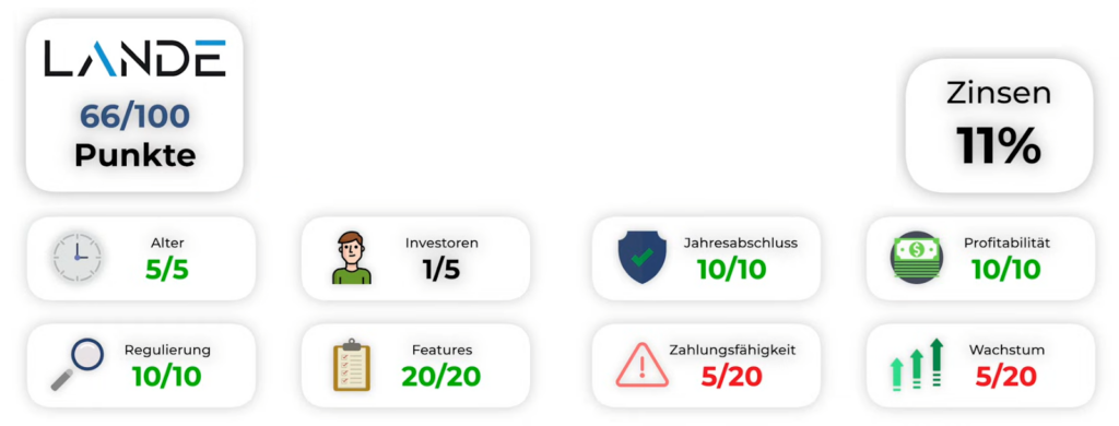 So wird Lande zum größten Verlierer im Northern Finance P2P-Kredite-Vergleich: 15 Punkte büßt man im Vergleich zum Vorjahr ein und schafft es nur noch auf 66/100. Für eine etablierte Plattform kein gutes Zeichen.