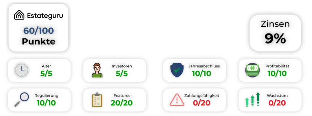 Insgesamt erreicht EstateGuru damit schwache 60 von 100 Punkten. Auch die gebotenen Zinsen von etwa 9 % sind deutlich zu mager, um den Anbieter attraktiv zu machen. Meine Empfehlung lautet daher: Finger weg!