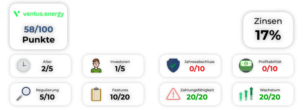 Mit seinen sehr hohen Zinsen und dem ungewöhnlichen Konzept hat Ventus Energy im Northern Finance P2P-Vergleich bereits für Aufsehen gesorgt. Auch in 2026 ist man wieder mit dabei: Du investierst hier in Energieprojekte wie Kraftwerke oder Solaranlagen. Im Gegenzug erhältst du bis zu 17 % Zinsen, die durch regelmäßige Bonusaktionen sogar noch höher ausfallen können.