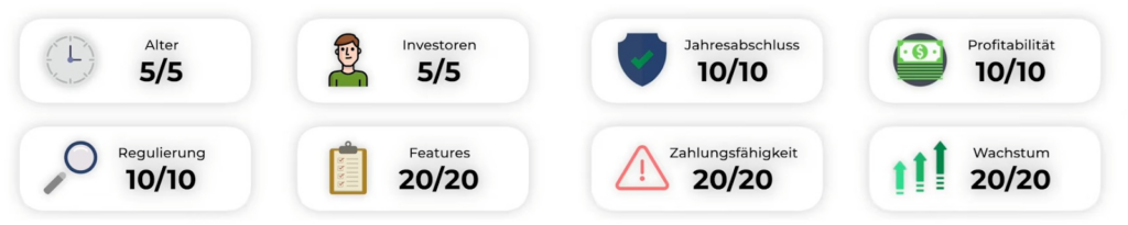 | Alter | Investoren | Geprüfer Jahrsabschluss | Profitabilität | Regulierung | Feautures | Zahlungsfähigkeit | Wachstum | Zinsen | Gesamt | |